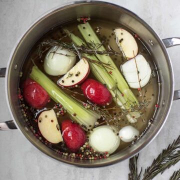 Place the salt, sugar, herbs, peppercorns, carrots, onions, celery, and apples into a large stock pan. Cover with cold, filtered water or chicken/turkey stock.